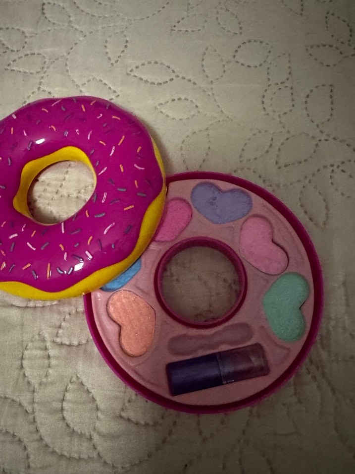 Pastel pembe kalp şeklinde göz farları ve küçük aplikatör fırça içeren, kapak kısmı donatılmış pembe donut tasarımlı palet.