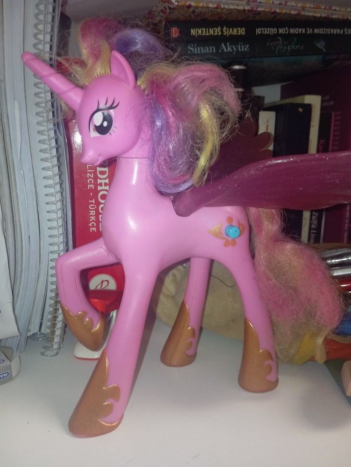 Pastel pembe renkte, kanatlı unicorn figür. Çok renkli yeleye ve detaylı gözlere sahip. Yanında küçük mavi-turuncu sembol bulunur.