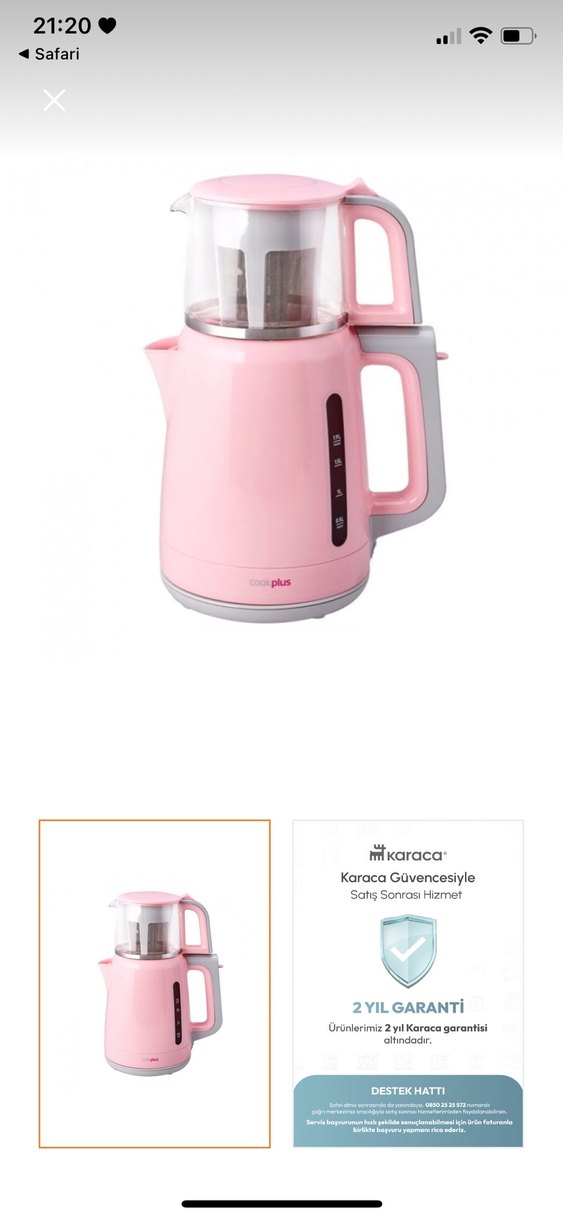 Pastel pembe renkte, su seviyesi göstergeli kulplu ve şeffaf üst hazneli çay makinesi. Karaca güvencesi ve satış sonrası hizmeti ile sunulur. Su ısıtma yerinin kulpunda hafif sararma dışında hiç bir problemi yoktur görseller eklidir