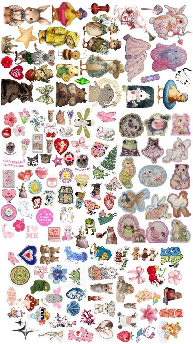 Pastel pembe tonlarında, çeşitli sevimli hayvanlar ve objeler içeren çıkartma seti. almal için ilan açtirmayı unutmayın