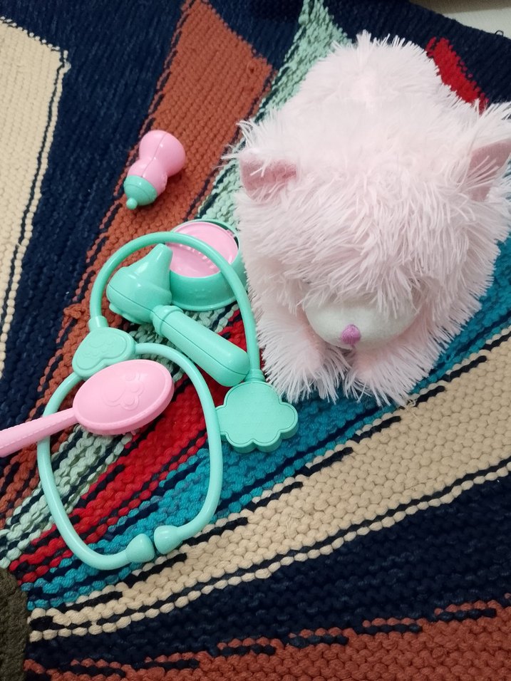 Pastel pembe ve nane yeşili kedi aksesuarları, oyun için stetoskop oyuncağı ve peluş kedi figürü içerir .