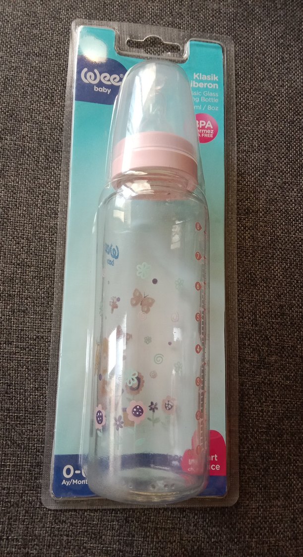 Pastel pembe renkte, klasik tasarımlı, yumuşak emzikli, BPA içermeyen 240 ml bebek biberonu. Ölçü işaretleri net.