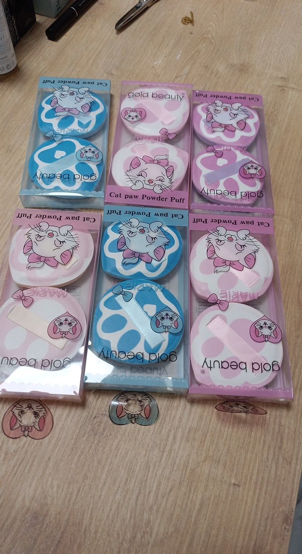 Pastel pembe ve mavi kedi pençesi desenli makyaj süngerleri, pürüzsüz fondöten uygulaması için yumuşak dokulu.