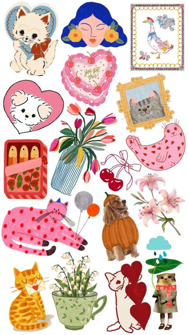 Pastel pembe tonlarında, kedi, çiçek ve kalp desenleri içeren sevimli ve renkli kedi aksesuarları seti.