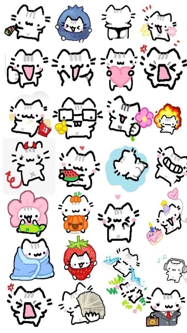 Pastel pembe renkte, çeşitli sevimli ve neşeli kedi ifadeleri ve pozları içeren kedi temalı çıkartmalar.