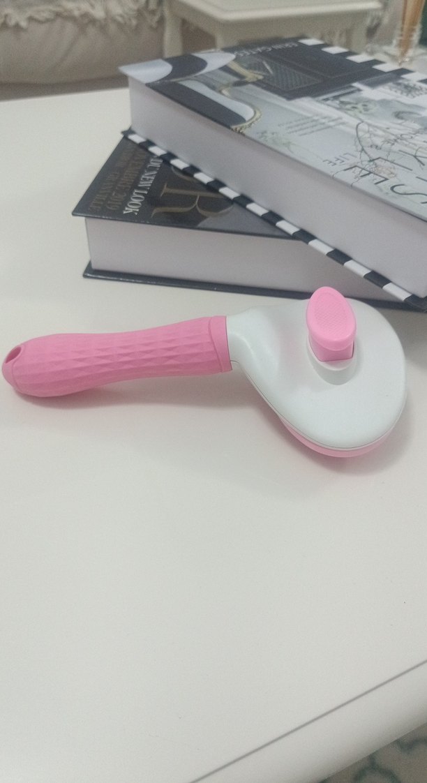 Pastel pembe renkli, ergonomik saplı kedi tüy toplama fırçası. Gevşek tüylerin etkili şekilde alınmasına yardımcı olur.