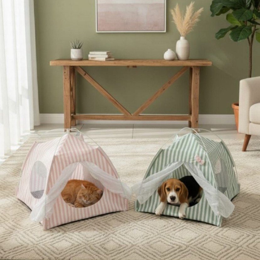 Pastel pembe ve yeşil çizgili, tül detaylı kedi ve küçük köpekler için iç mekan dinlenme evleri.