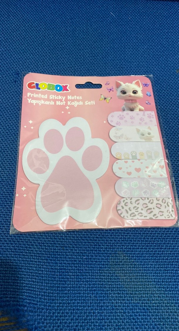 Büyük pati şeklinde ve beş küçük desenli yapışkanlı not kağıdı içeren pastel pembe set. CLOBOX markalı, notlarınıza sevimli bir dokunuş sağlar.