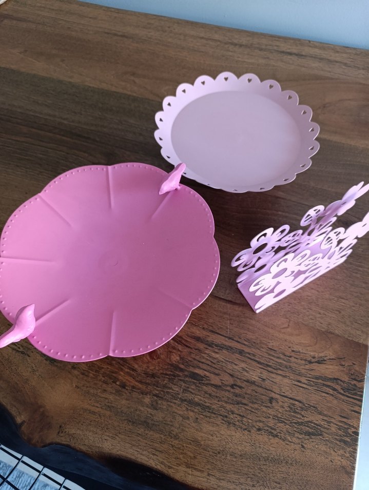 Pastel pembe renkli, kenarları fırfırlı kek kalıbı ve sunum tabağı seti. Şık sunum için