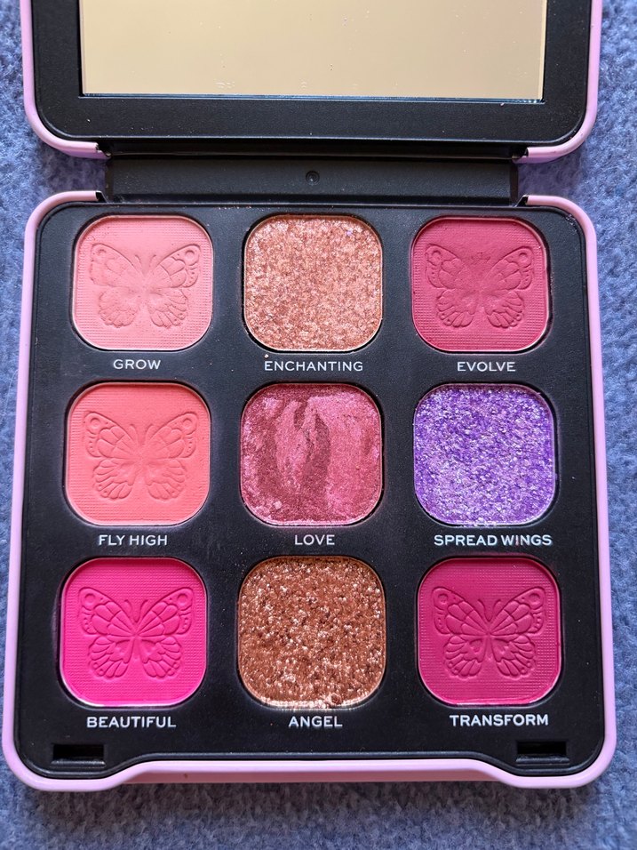 Pastel pembe renkte, kapağında kelebek deseni bulunan kompakt boyutta blush.