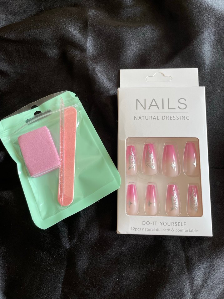 Pastel pembe tonlarında, doğal görünümlü 12 adet yapay tırnak ve tırnak bakım araçları içeren kendin yap seti. Rahat kullanım sağlar.