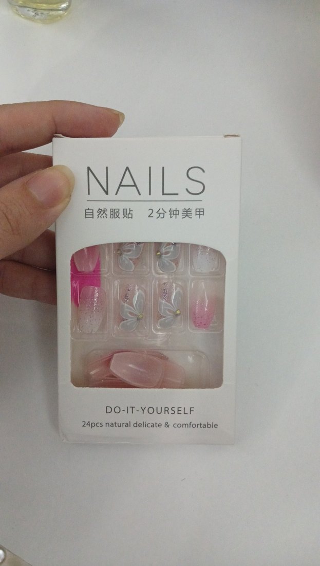 Pastel pembe tırnak süslemeleri, narin kelebek desenleri ile. Kolay uygulanabilir 24 doğal ve rahat parça içerir.