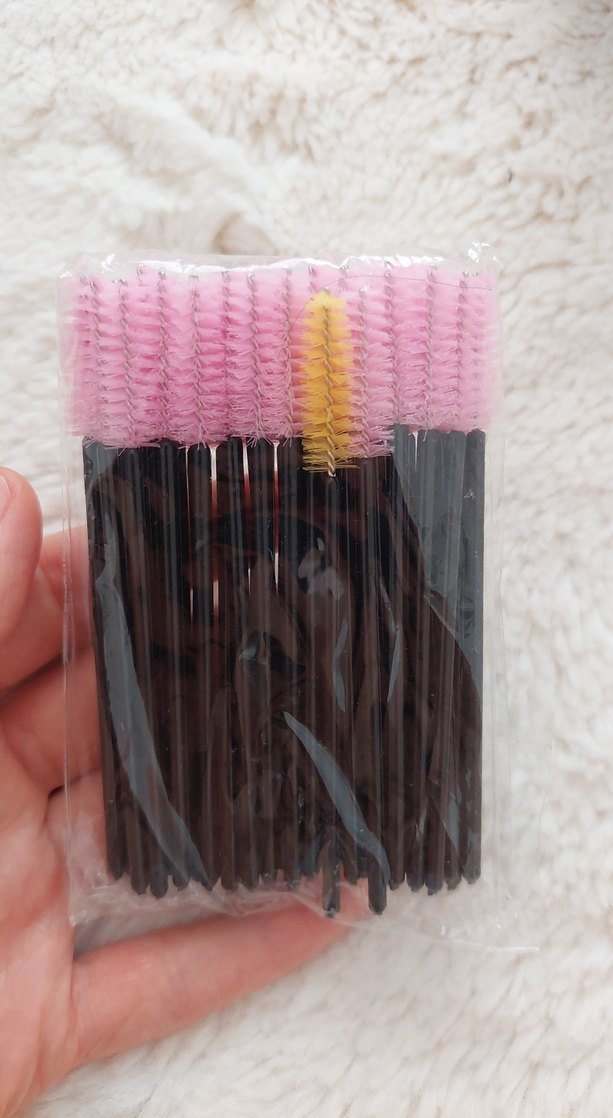 Pastel pembe kirpik fırçaları ve siyah saplardan oluşan set, hassas uygulama için bir adet sarı spoolie fırça içerir. ️