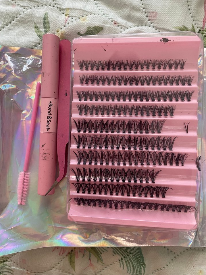 Çeşitli uzunluklarda pastel pembe takma kirpikler, pembe aplikatör ve fırça içerir. Ürün üzerinde Bond&Seal yazısı bulunur. ️
