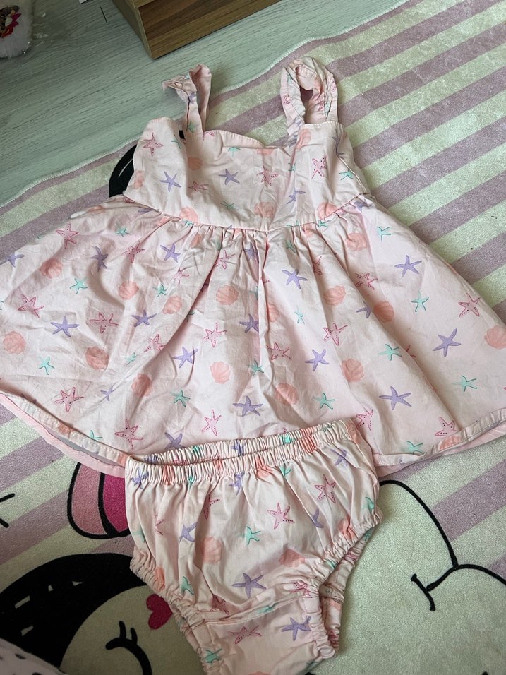 Pastel pembe renkli, askılı ve fırfırlı detaylara sahip kız çocuk elbisesi. Yumuşak sentetik kumaştan, bol kesim ve hafif batik yıldız desenli. Aynı kumaştan şortlu.