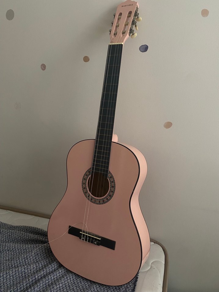 Pastel pembe klasik gitar, yumuşak yüzey ve naylon tellerle başlangıç ve hobi için uygun. Tellerinin değişmesi lazım ve ufak bi defosu var kullanıma engel değil