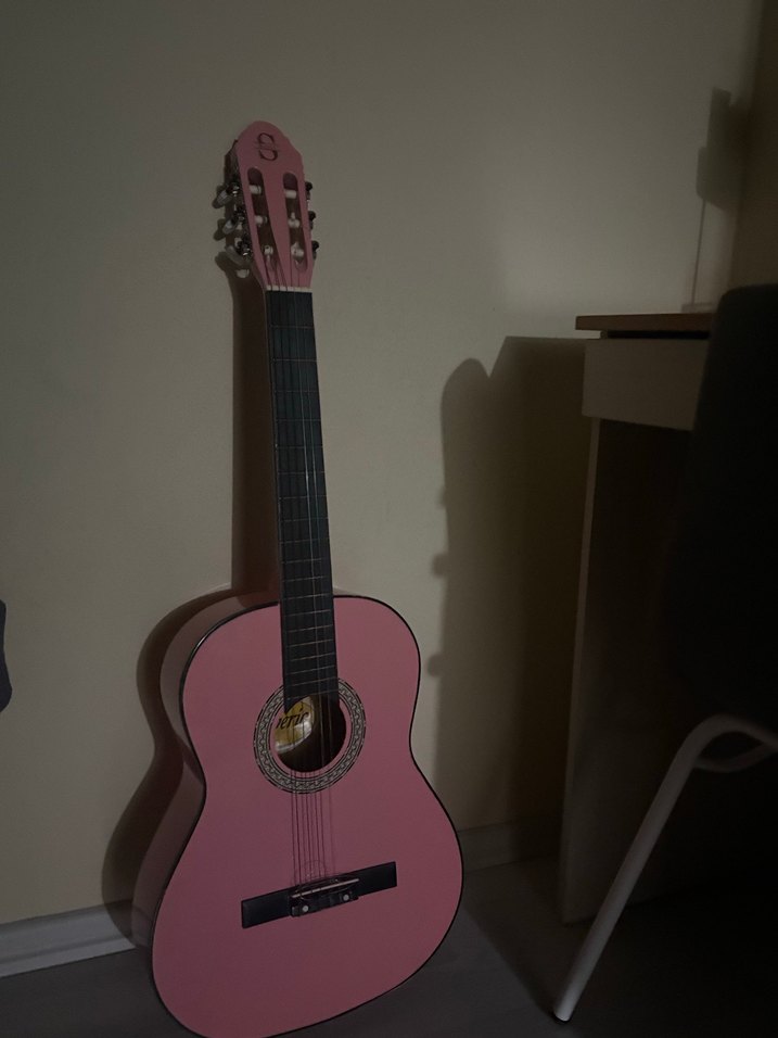 Pastel pembe renkte, altı telli klasik gitar, geleneksel gövde şekline sahiptir.