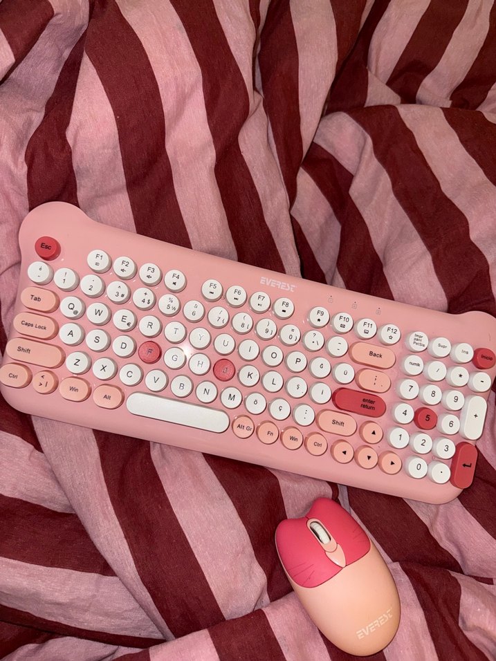 Pastel pembe renkte, yuvarlak tuşlara sahip klavye ve mouse seti, şık ve rahat bir kullanım sunar.