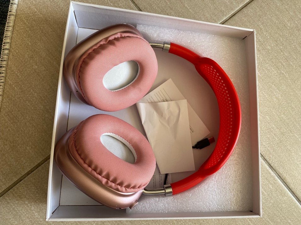 Pastel pembe kulaklık, yastıklı kulak pedleri ve ayarlanabilir kırmızı kafa bandı ile rahat kullanım sağlar.
