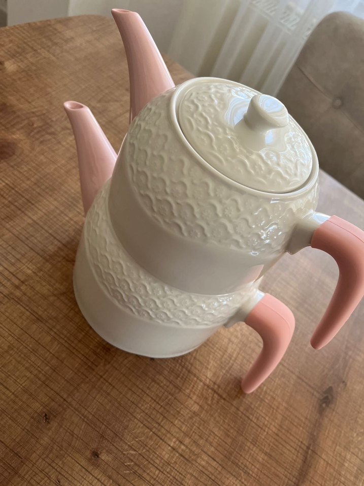 Pastel Pembe Kulplu Beyaz Çaydanlık