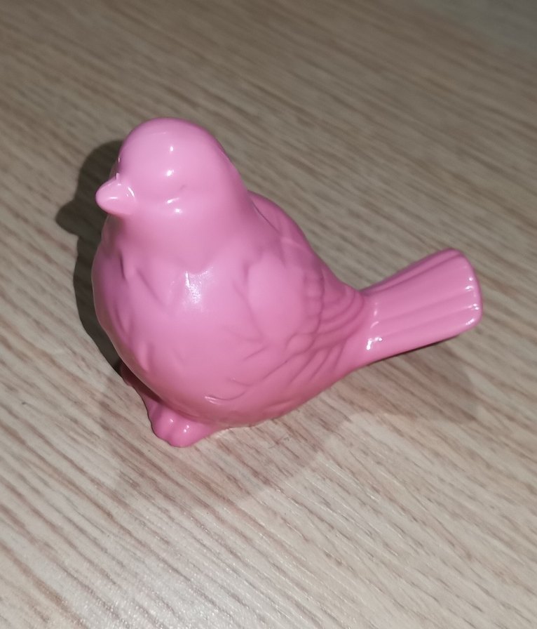 Pastel pembe renkte, parlak yüzeye sahip kuş figürü, dekoratif amaçlı kullanılabilir.