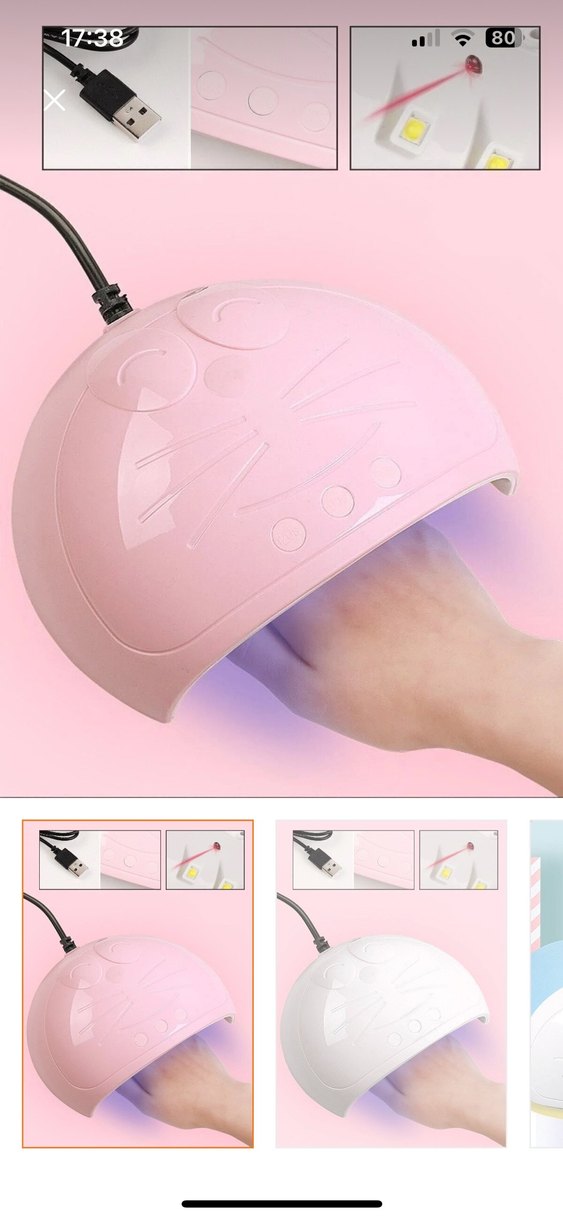 Pastel pembe renkte, USB bağlantılı LED tırnak kurutucu. Hafif ışıkla tırnak cilasını hızlıca kurutur.