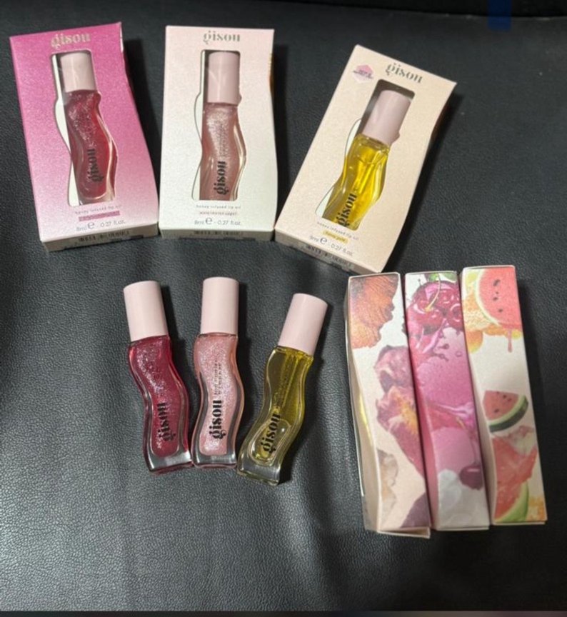 (3 üçlü set)Parlak bitişli pastel pembe lip gloss seti, hafif ışıltılı tonlar içerir. Küçük, kıvrımlı tasarımlı şişelerde paketlenmiştir.