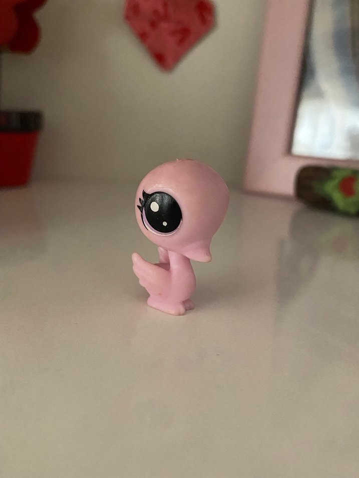 Pastel pembemsi renkte, büyük gözlü ve yuvarlak hatlara sahip LPS Kuğu Miniştir. Küçük kuyruğu ve dik duruşu vardır.Orjinaldir.Yepyeni, sadece kafa kısmında küçük beyaz bir şey var.Orta boydur.