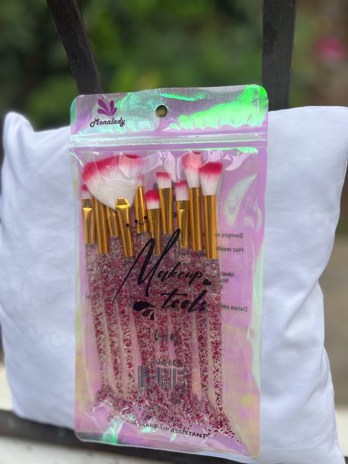 Altın saplı, çeşitli makyaj fırçalarından oluşan pastel pembe set. Balık figürlü Parlak, yeniden kapatılabilir bir poşette sunulur. ✨