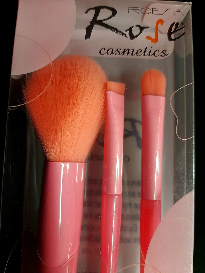 Yumuşak kıllara sahip üç pastel pembe makyaj fırçası seti. Ambalajda "Rose cosmetics" markası yer alıyor.