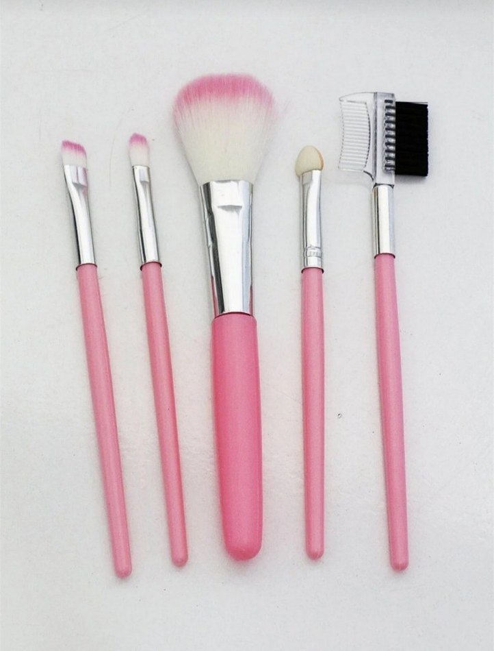 Pastel pembe renkte, yumuşak kıllı ve ergonomik saplı 5'li makyaj fırça seti.