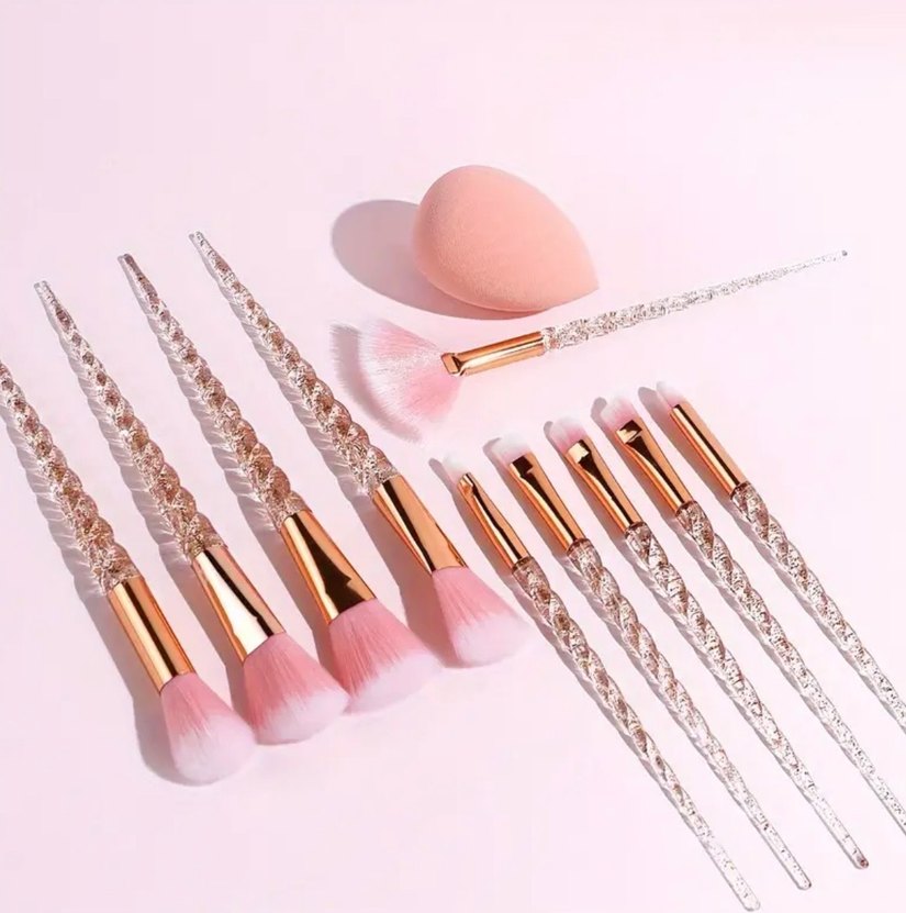 Pastel pembe tonlarında, şeffaf burgu saplı ve yumuşak kıllı çeşitli makyaj fırçaları ile sünger seti. Makyaj uygulamak için uygundur.