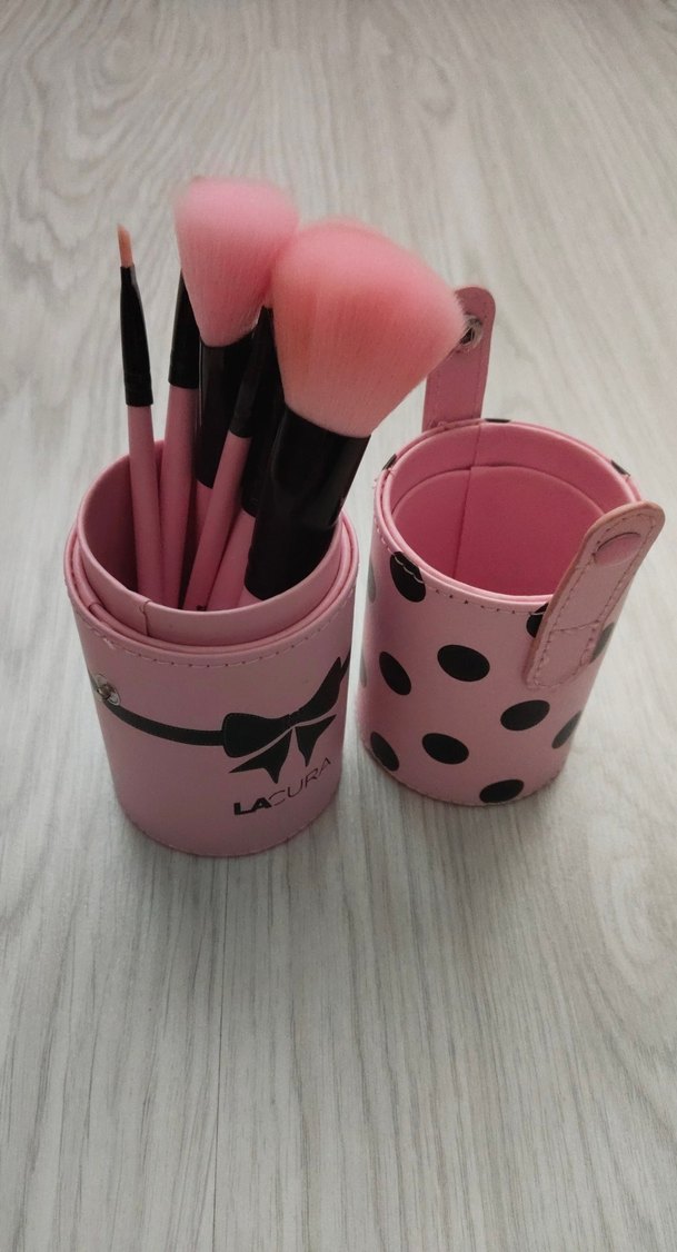 Yumuşak kıllı pastel pembe makyaj fırçaları, puantiyeli ve fiyonk desenli pembe kutuda saklanır.