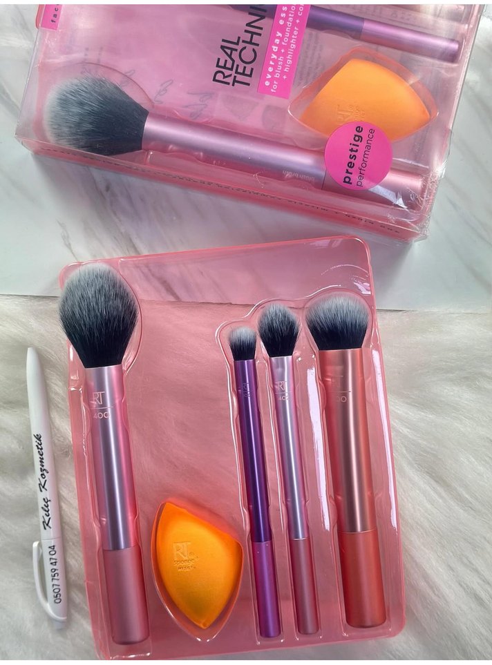 Pastel pembe renkte makyaj fırçası seti, farklı boyutlarda fırçalar ve makyaj süngeri içerir. ️