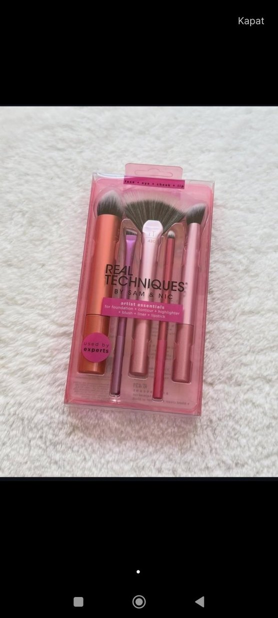 Pastel pembe renkte, fondöten, kapatıcı, aydınlatıcı ve allık için çeşitli makyaj fırçaları içeren Real Techniques seti. Uzmanlar tarafından kullanılır.