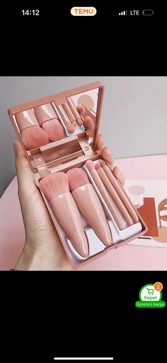 Pastel pembe makyaj fırçası seti, farklı boyutlarda yumuşak kıllı fırçalar ve ayna içeren kompakt bir kutuda sunulmuştur.