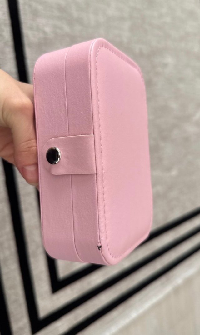 Pastel pembe renkte, yumuşak dokulu ve çıtçıtlı kapaklı makyaj organizer kutusu.