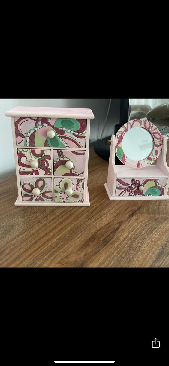 Pastel pembe renkte, çiçek desenli çok çekmeceli makyaj organizerı ve küçük çekmeceli aynası, kozmetik saklamak için uygun.