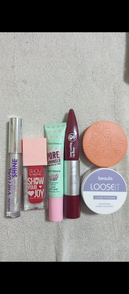 Bu pastel pembe makyaj seti, dudak parlatıcısı, sıvı allık, gözenek küçültücü, dudak balsamı, allık ve loose pudra içerir. çok az kullandım fiyat sorunuz