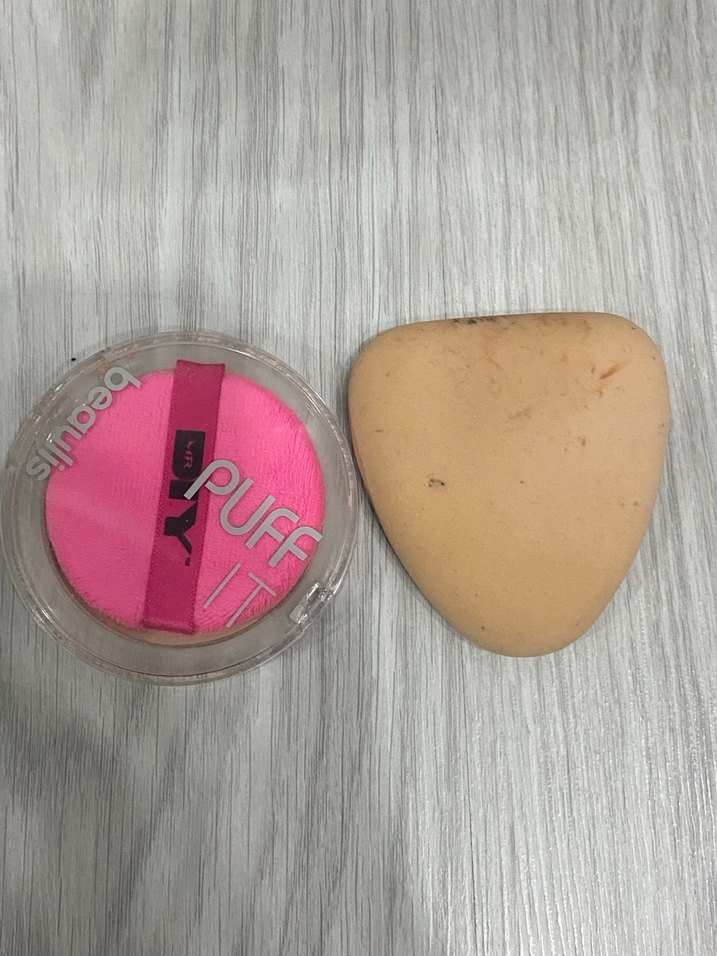 Pastel pembe renkte, yumuşak dokulu makyaj süngeri, "ERUFF" yazılı şeffaf kutusu ile birlikte.