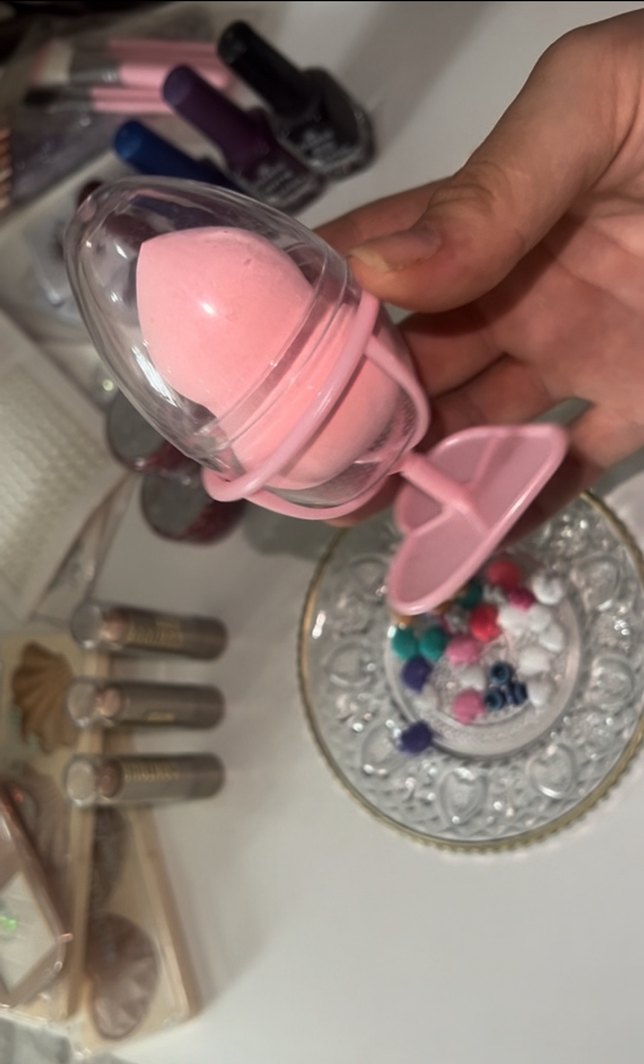 Koruyucu şeffaf kapaklı ve standlı pastel pembe makyaj süngeri, kolay kullanım ve saklama sağlar. Pürüzsüz makyaj için uygundur.