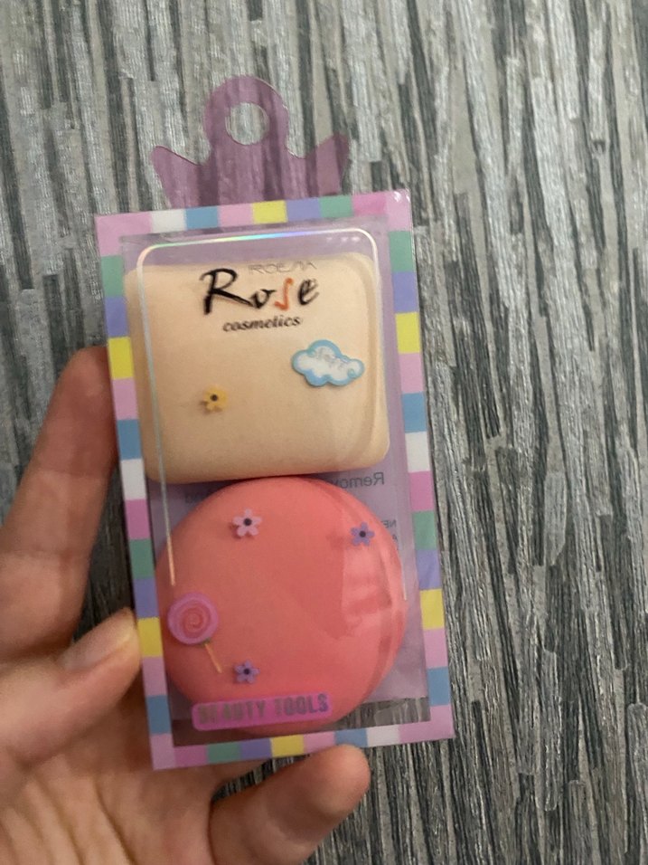 Rose Cosmetics'ten pastel pembe ve bej renkte, makyaj uygulaması için süngerler. Küçük dekoratif detaylara sahip.