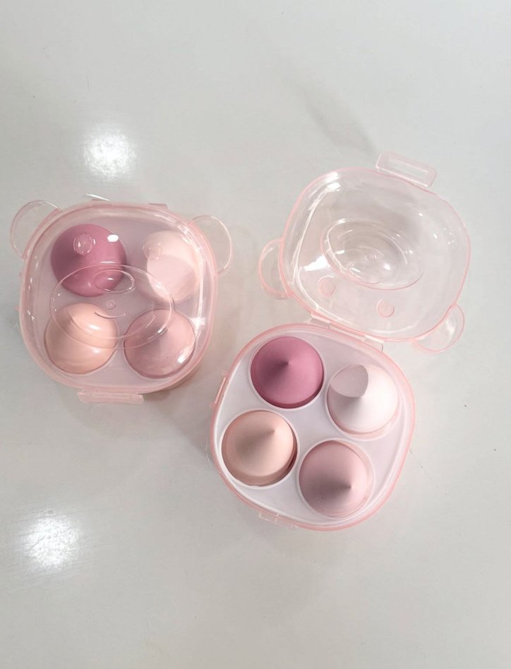 Şeffaf kutuda dört pastel pembe makyaj süngeri seti, pürüzsüz uygulama için uygun.