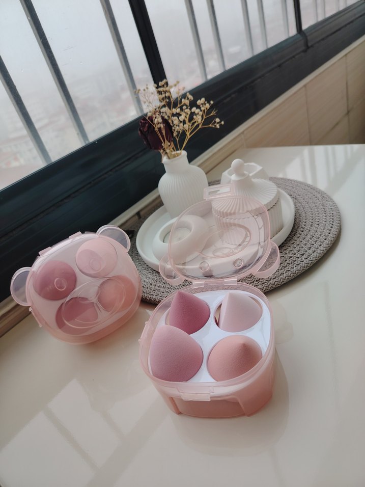 Pastel pembe renkte, farklı şekillerde makyaj süngerleri seti, kullanımı ve taşınması kolay kompakt kutuda saklanır.