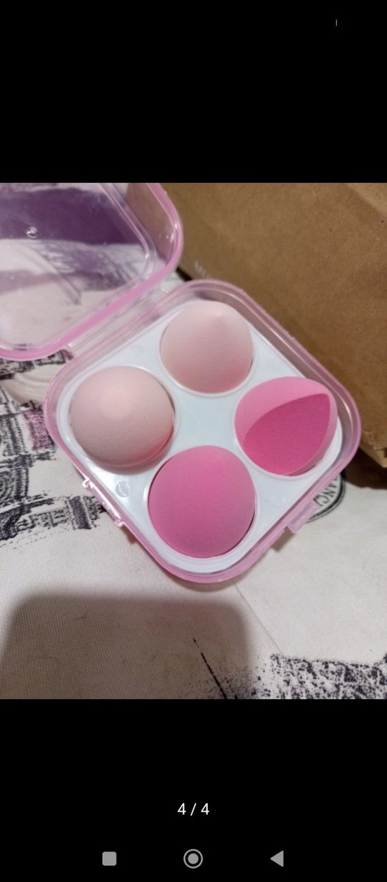 Çeşitli şekillerde dört adet pastel pembe makyaj süngeri, şeffaf pembe kutuda saklanmaktadır. Pürüzsüz ve eşit makyaj uygulaması sağlar.