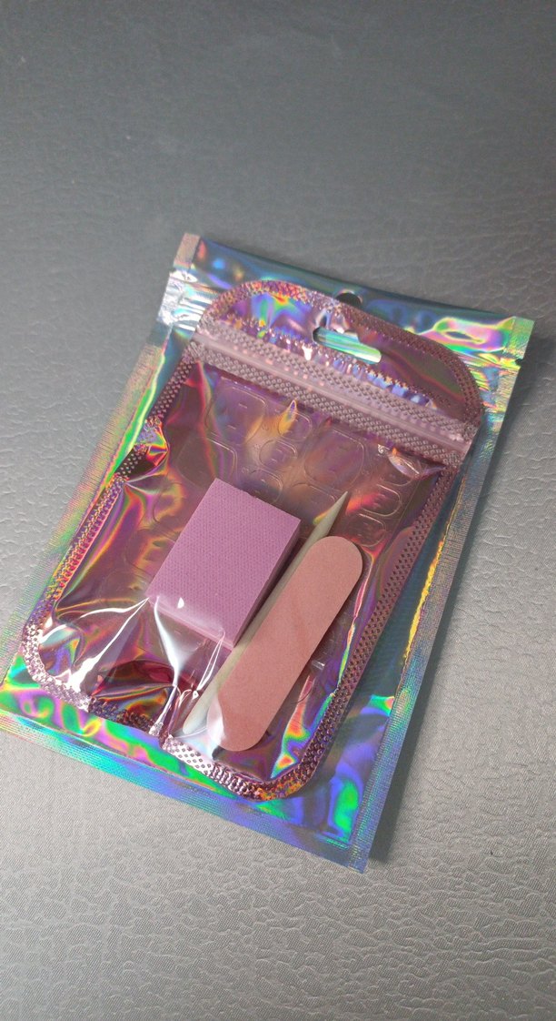 Pastel pembe makyaj süngeri seti, dikdörtgen sünger ve tırnak törpüsü içerir. Holografik kilitli poşette sunulur.