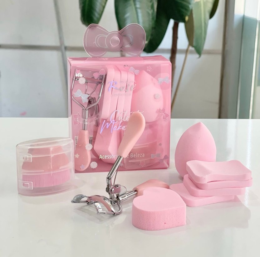 Çeşitli şekillerde pastel pembe makyaj süngerleri ve metal kirpik kıvırıcı içeren set, pürüzsüz makyaj uygulaması sağlar.
