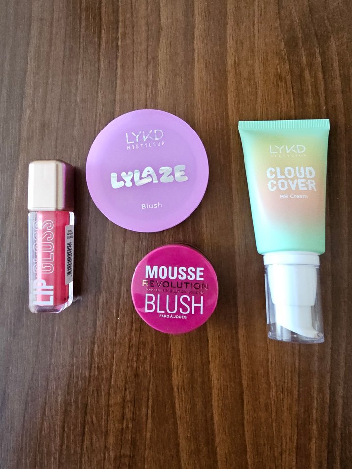 Set, pastel pembe lip gloss, mousse allık, kompakt allık ve BB krem içerir. ürunler bir yada iki kere denendi