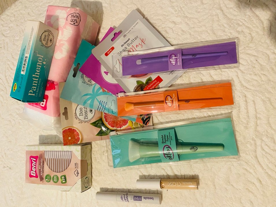 Bu set, cilt bakımı ve makyaj uygulaması için pastel pembe renkli makyaj mendilleri, yüz kremi tüpü ve aplikatörler içerir.