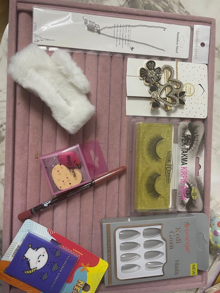 Pastel pembe tonlarında takma tırnak, kirpik, dudak kalemi, peluş saç bandı, küpe ve kolye içeren makyaj ve aksesuar seti. ️